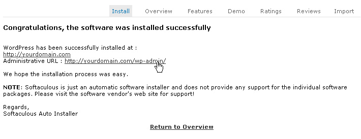 | Через несколько мгновений, Softaculous даст вам знать, что завершено