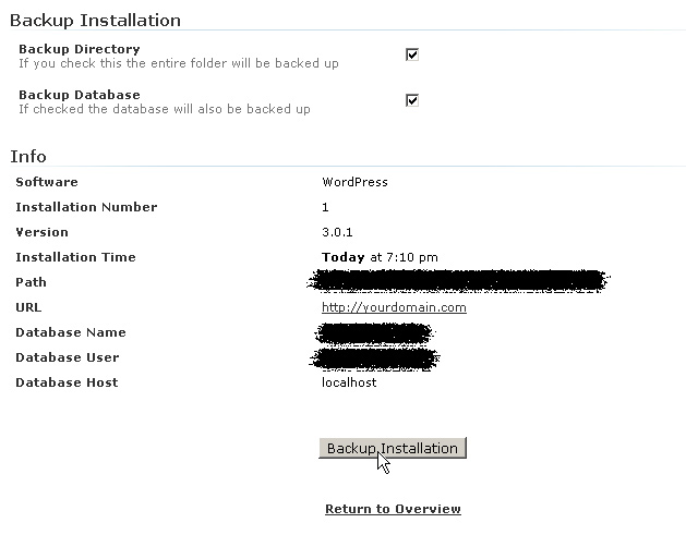 весь сайт. Нажмите кнопку Backup Installation и подтвердите, что вы